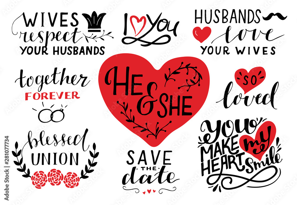 Set of 9 hand lettering quotes about he and she. Save the date